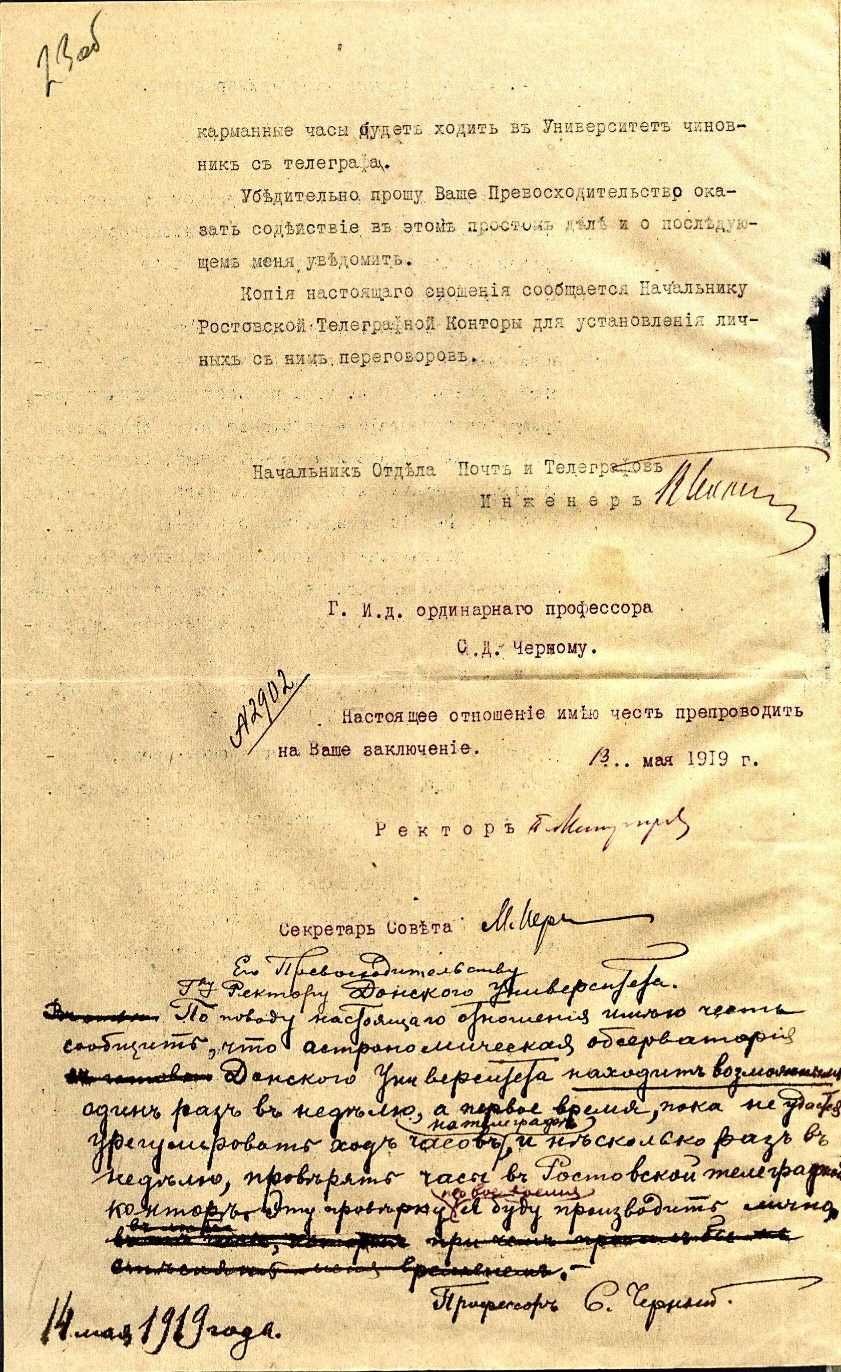8 мая 1919 года начальник Управления почт и телеграфов Сергей Чаплин направил официальное письмо ректору Донского университета. Повод был чрезвычайным: от Ростова и по всему Кавказу перестало действовать точное петроградское время, и часы показывали «возможно вообще не правильное» время. Решить проблему мог только университет.